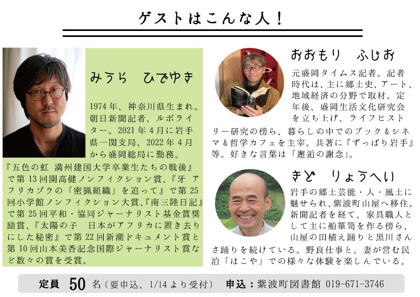 50名(要申込)1月14日(水)10時から受付開始です。 電話 019-671-3746または図書館カウンター、申込フォームからお申し込みください。