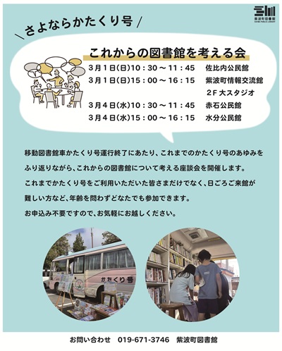 また、運行終了にあたり、図書館の今後を考える「さよならかたくり号~これからの図書館を考える会」 及び写真撮影会を実施します。どうぞご参加ください。